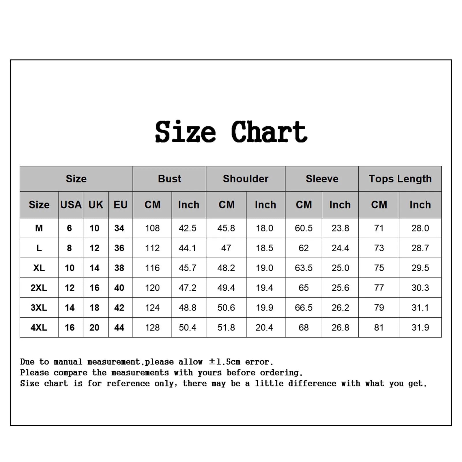 Size: 4XL, Length: 81cm/31.9", Bust: 128cm/50.4", Shoulder: 51.8cm/20.4", Sleeve: 68cm/26.8" (Approx.)